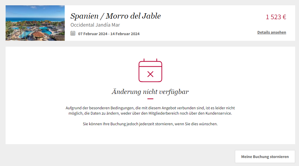 Die Änderung ist für die folgenden Angebote nicht verfügbar: Angebote mit Transport, Kreuzfahrten, Restaurants, Roadtrip, Multihotels oder Angebote von Reiseveranstaltern.