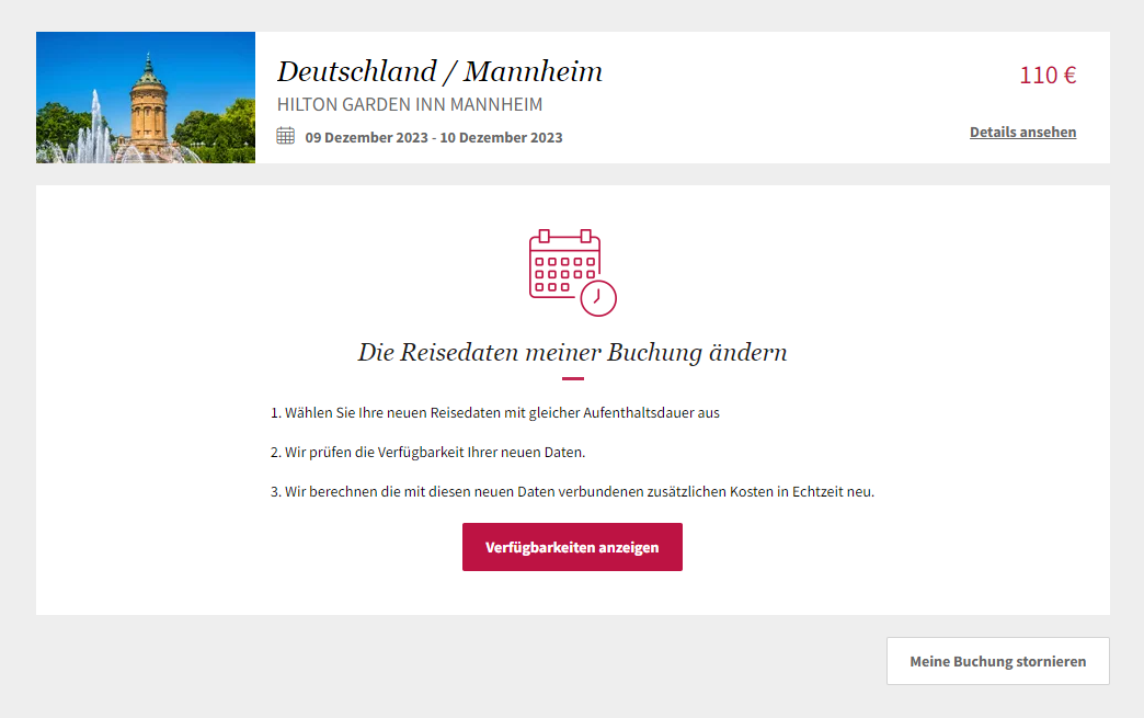 Wenn Ihr Angebot in Frage kommt, klicken Sie auf "Verfügbarkeiten anzeigen" und wählen Sie Ihre neuen Aufenthaltsdaten aus. Dieser Änderungsantrag unterliegt der Zustimmung unserer Hotelpartner.
